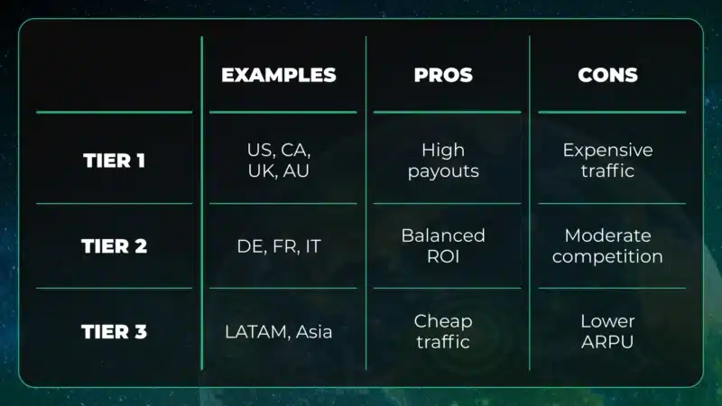 - Tier 1 → Best for scaling high-quality traffic and maximizing EPC